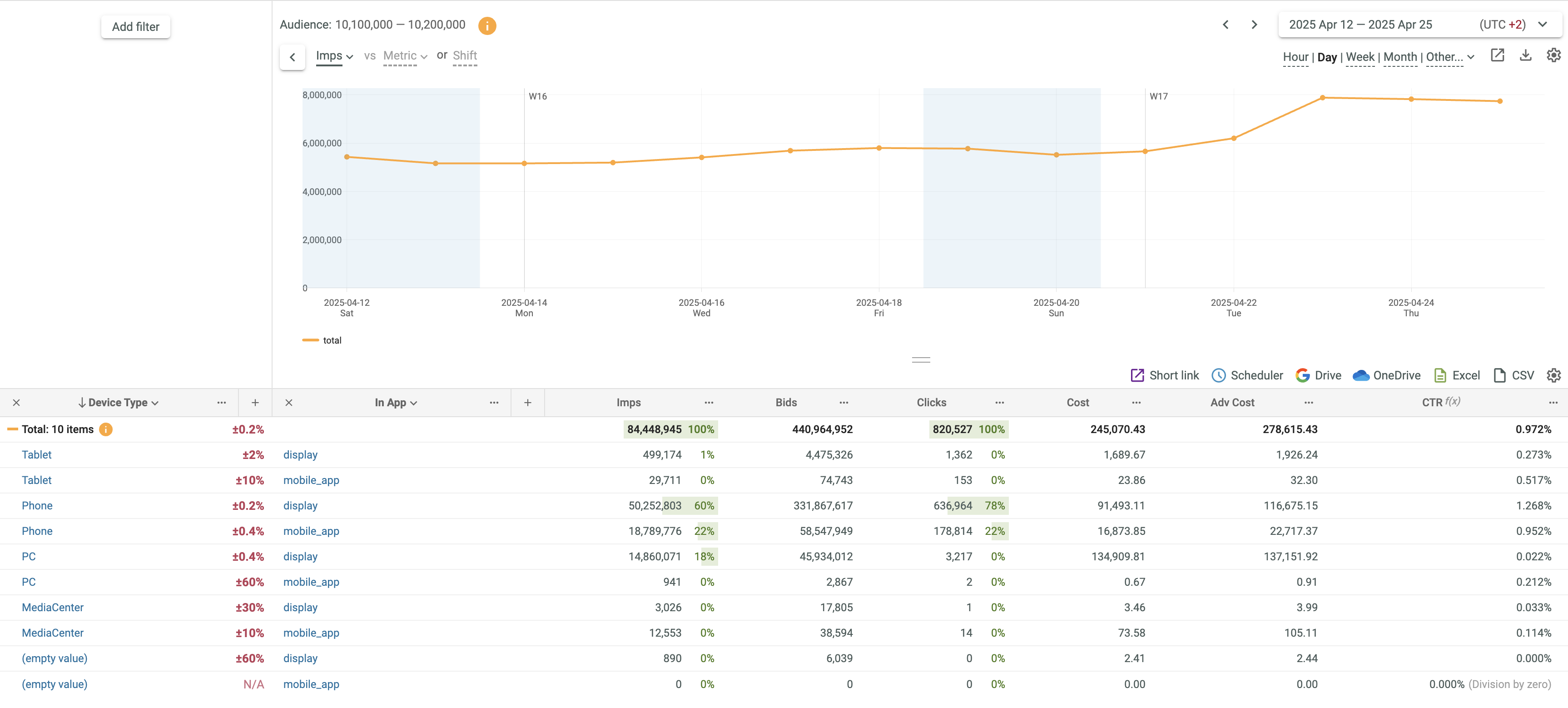 - The 1 and 2 signs in the key field headers show that sorting is performed by two columns (first by Device Type and then by Browser).